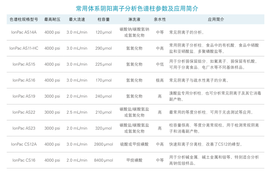 戴安開發的系列氫氧化物淋洗液分析柱,代表了離子色譜陰離子分析的最新發展方向。具有背景低,噪音小,靈敏度高的特點??捎糜谔荻攘芟春投S
