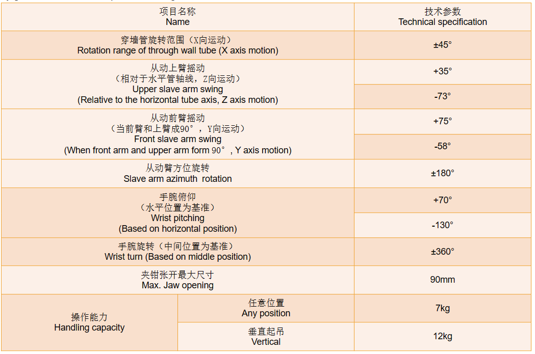 LJ205中小型熱室主從關(guān)節(jié)機械手為非密封型主從機械手。所有力和運動的傳遞由鋼絲繩、鏈條和齒輪來完成,具有7個自由度,同時有力反饋。