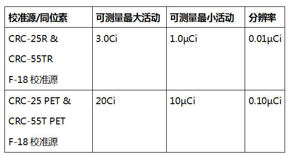 CRC-25R和CRC-25PET放射性核素活度計測量范圍和分辨率的比較